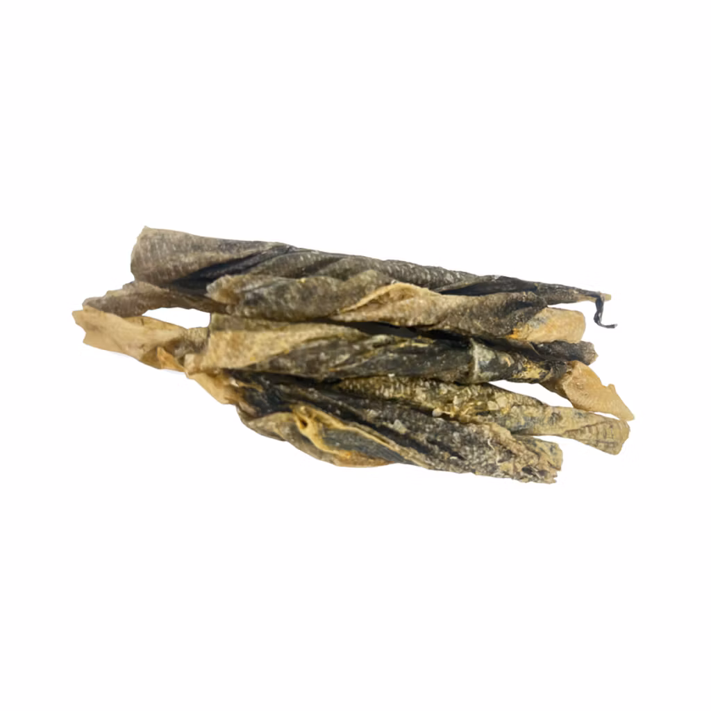 Spröda, tvinnade bitar av 100 % naturligt torskskinn – perfekt för hunden som älskar fisk. Den krispiga konsistensen ger ett lättare tuggmotstånd och passar både som belöning och som ett smakrikt mellanmål.